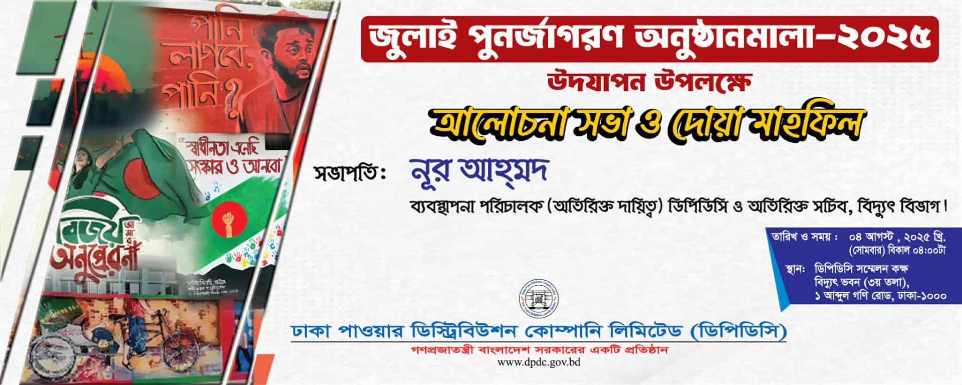 ডিপিডিসি'র ব্যবস্থাপনা পরিচালক জনাব নূর আহ্মদ মহোদয়ের সভাপতিত্বে "জুলাই পুনর্জাগরণ অনুষ্ঠানমালা-২০২৫" উদযাপন উপলক্ষে আলোচনা সভা ও দোয়া মাহফিল অদ্য ০৪ আগস্ট , ২০২৫খ্রি. (সোমবার) বিকাল ০৪:০০ টায় ডিপিডিসি'র বোর্ড রুম এ অনুষ্ঠিত হয়। সভায় ডিপিডিসি’র ঊর্ধ্বতন কর্মকর্তাগণ সরাসরি এবং On-Line Zoom এর মাধ্যমে উপস্থিত/সংযুক্ত ছিলেন।